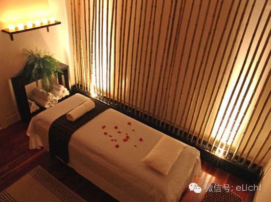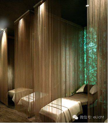 图:森林、绿洲的光,用一射灯投射在帷幔上犹如一道光瀑布映入眼帘,内部做一个绿色的发光背景墙,让你进入躺下时犹如走进森林,拥抱自然。发光背景墙的材质最好选用半透明的,注意灯具与墙的距离,不能太近,以免出现光线不均。