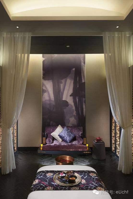 图:舒适、惬意、浪漫的光,埋地灯+射灯+烛台,紫色+3000K,用光色区分空间的同时使空间紧密联合,同时唤醒内心的情结,提高生活的品味,在纷繁的生活中慰藉心灵的疲惫。