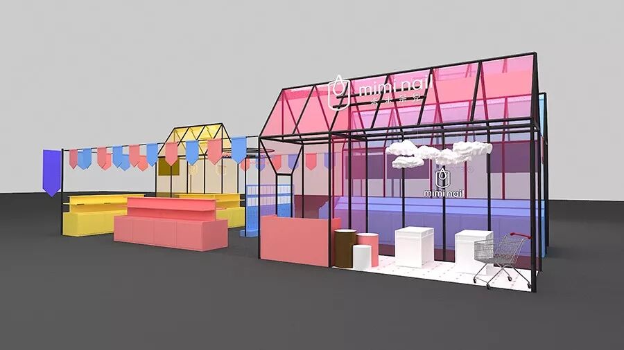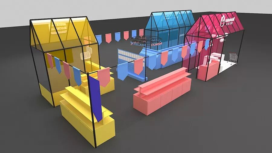 ▷ 这个展台群由粉色、蓝色、黄色3个主色调构成。