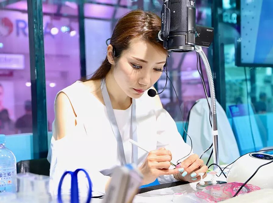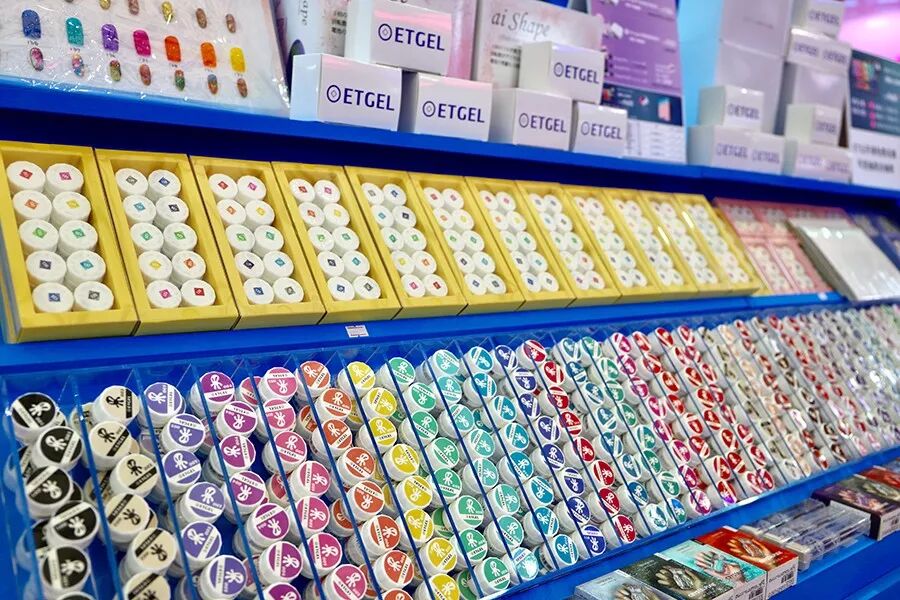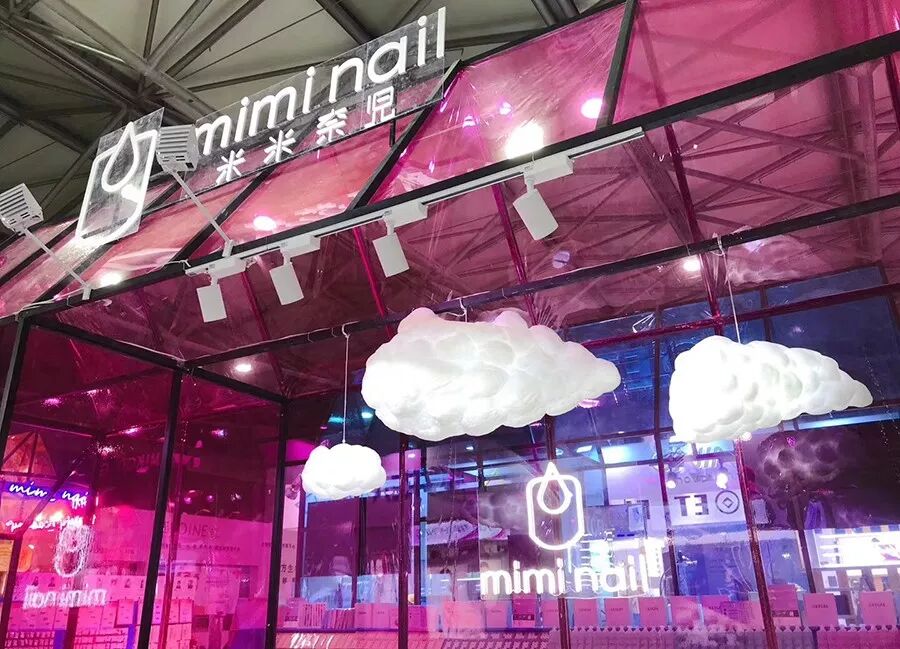 ▷ 据了解,这片展区由主营美甲美睫业务的上海杜米贸易有限公司打造,为杜米市场部3人设计团队全原创作品,意在传递“美业本是时尚”的理念。粉色展台是杜米旗下美甲美睫沙龙品牌“米米奈儿”,取粉色代表少女情怀;蓝色展台是杜米自有光疗美甲胶品牌“ETGEL”,以蓝色代表宇宙神秘;黄色展台是杜米代理的日本睫毛品牌“松风”,用黄色代表朝气明媚。