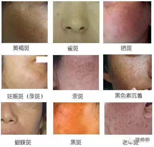 2 活性斑-是由于络氨酸酶的活性造成的斑,性质不稳定,易受外界的日光及内分泌等因素影响,颜色深浅发生变化。例如:雀斑、黄褐斑、继发性色素沉着