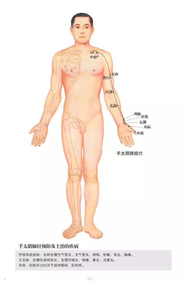 从肺系--气管、喉咙部横出腋下(中府、云门),下循上臂内侧,走手少阴,手厥阴经之前(天府、侠白),下向肘中(尺泽),沿前臂内侧桡骨边缘(孔最),进入寸口--桡动脉搏动处(经渠、太渊),上向大鱼际部,沿边际(鱼际),出大指的末端(少商)。