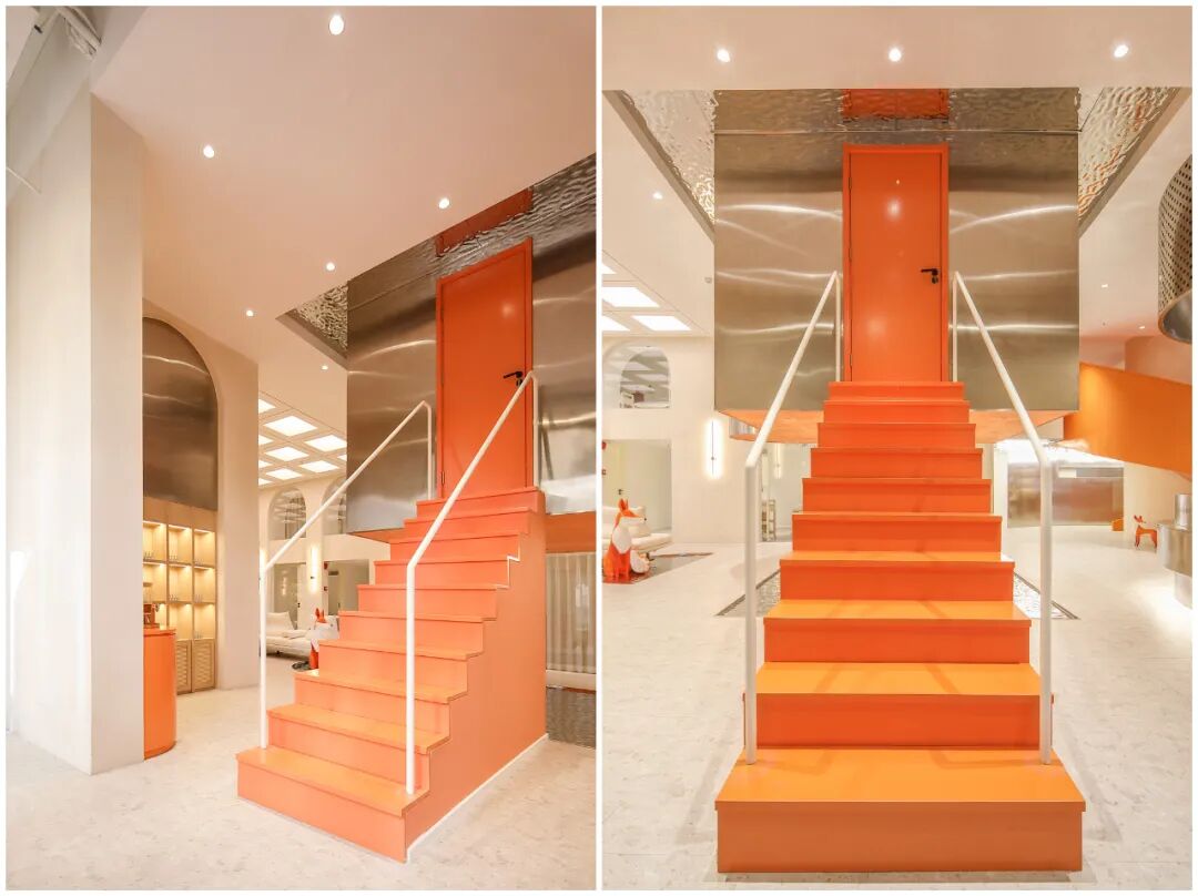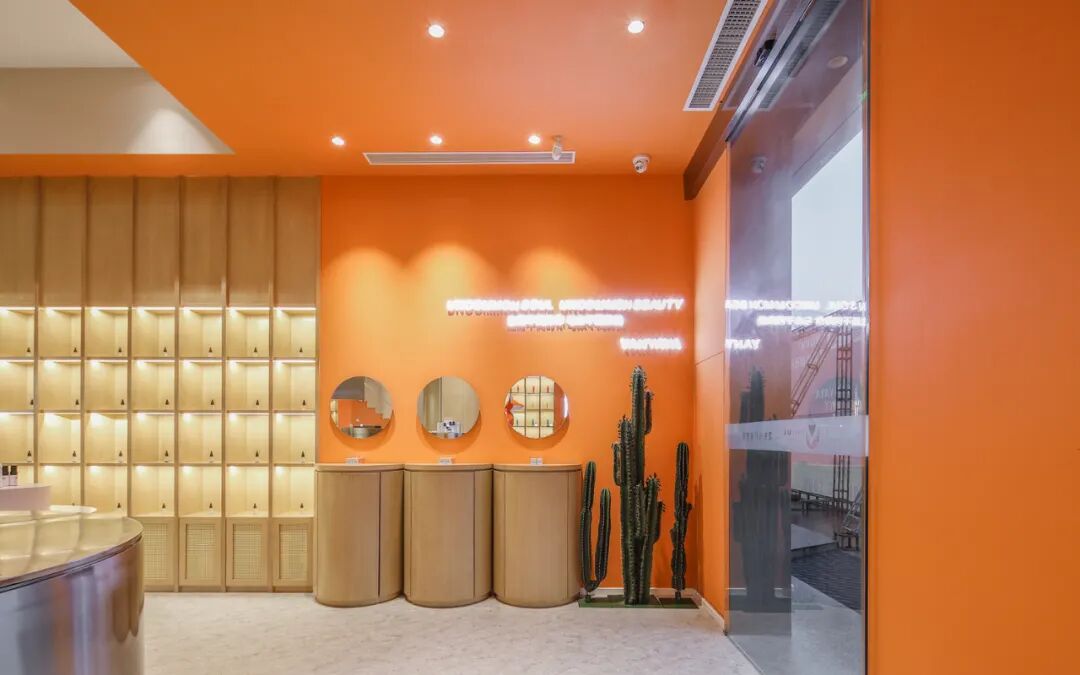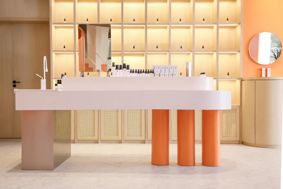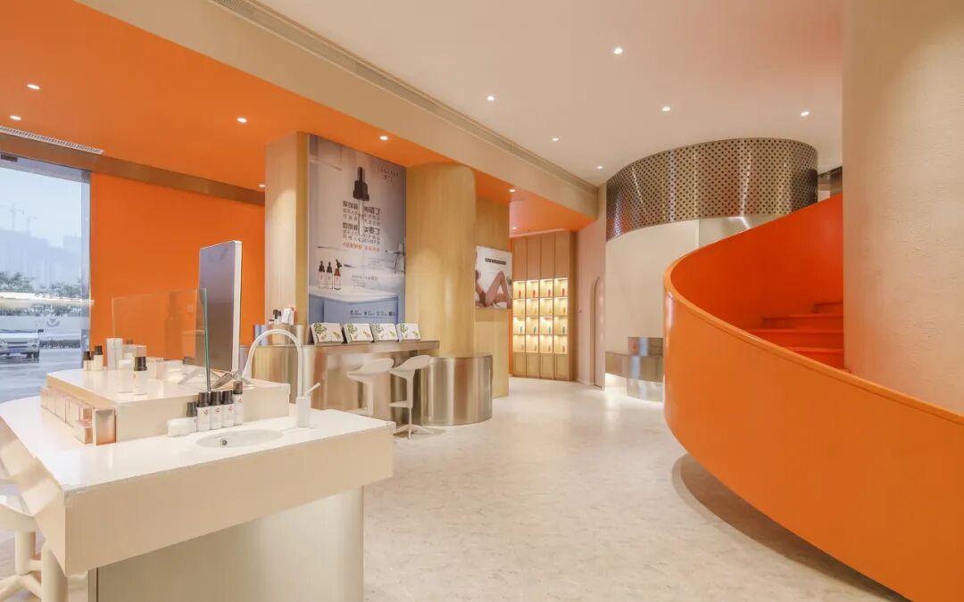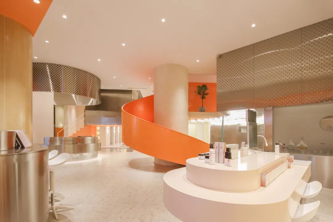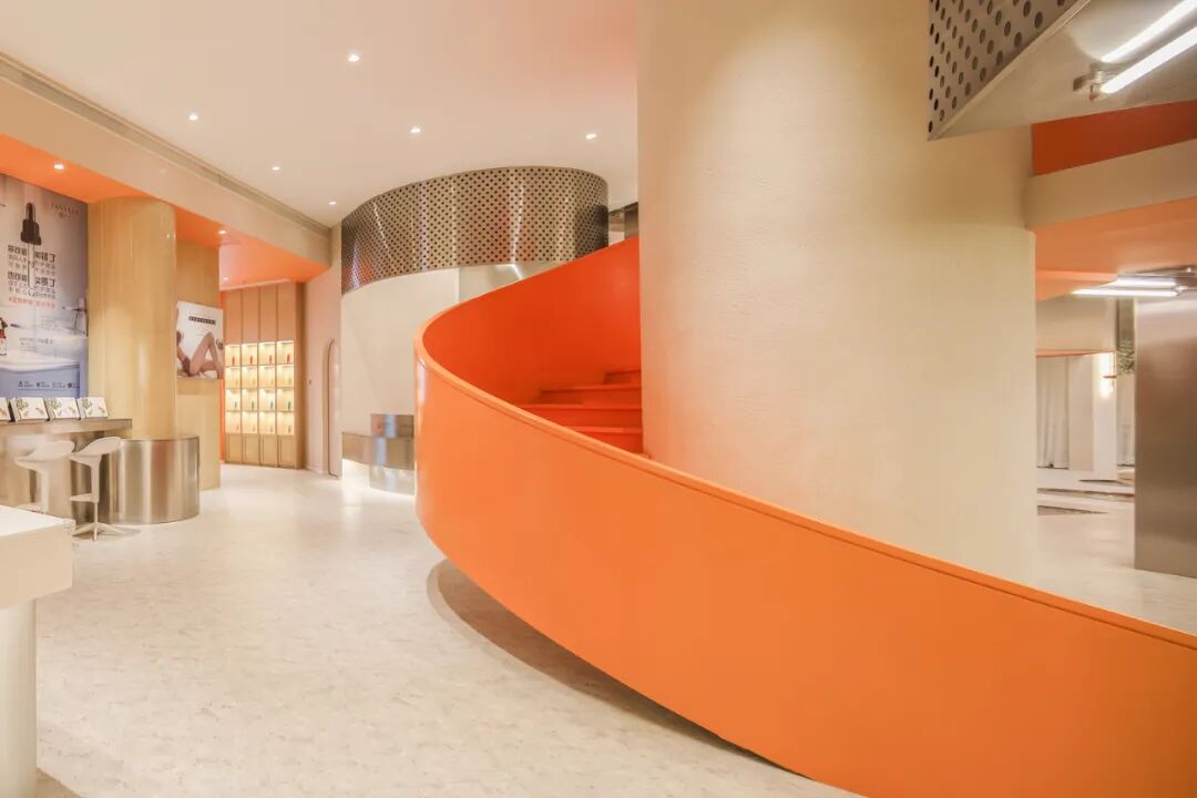 ▷ 橙色弧形楼梯:前场中心区域用一个通往2层的弧形楼梯自然把零售区和美容服务区做了划分。在视觉上楼梯的出现是整个零售前场的中心;在空间上又有效的阻挡了对于服务空间的直视,保证了的相对私密性;在使用流线上同时作为上下交通的核心区域。