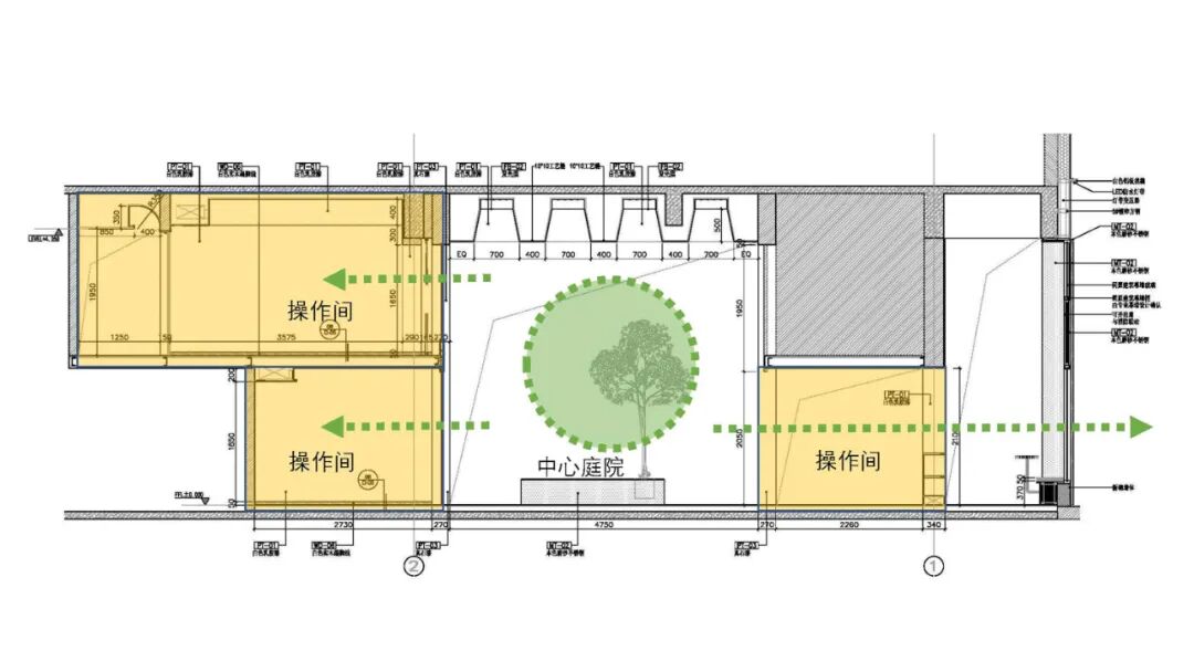 ▷ 因为原始层高并不富裕,所以操作间的划分方式、空调设备的走向、消防管线的布置,直接影响到项目是否可以恰当的使用。相对于之前的对于设计逻辑和美学上的探讨,结构和设备的各项技术参数也是对于项目是否能够合理实现的非常重要的部分。最终在设计各位技术负责人的通力配合和现场施工人员的共同努力下,在有限的高度下实现高空间利用率。