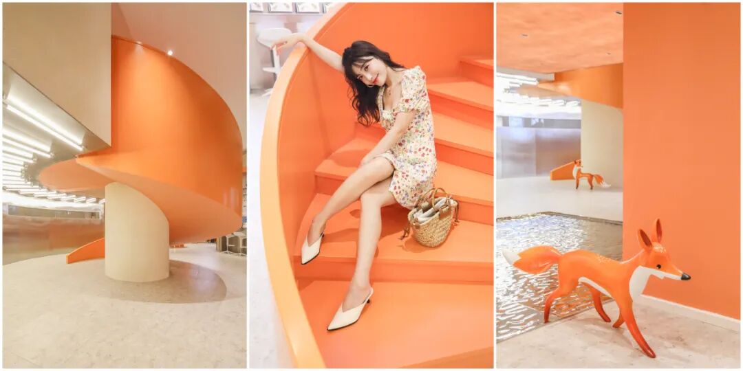 ▷ 抽象的表达方式:橙色的弧形楼梯,楼梯的扶手下小上大,螺旋上升,神似狐狸的迷人的大尾巴。
