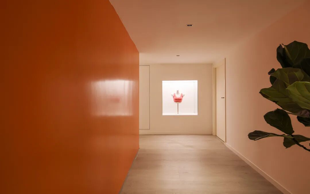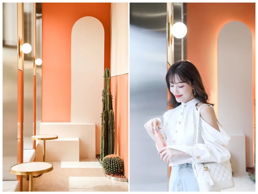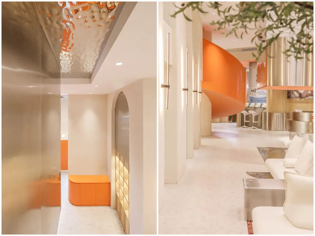 ▷ 色彩的选择——设计从原有的VI(视觉识别系统)中提取品牌色 —— 橙色、沙色,优雅柔美。加入白色、银色等中性色,使空间富有层次感且融合度高。