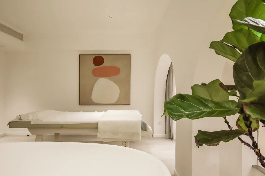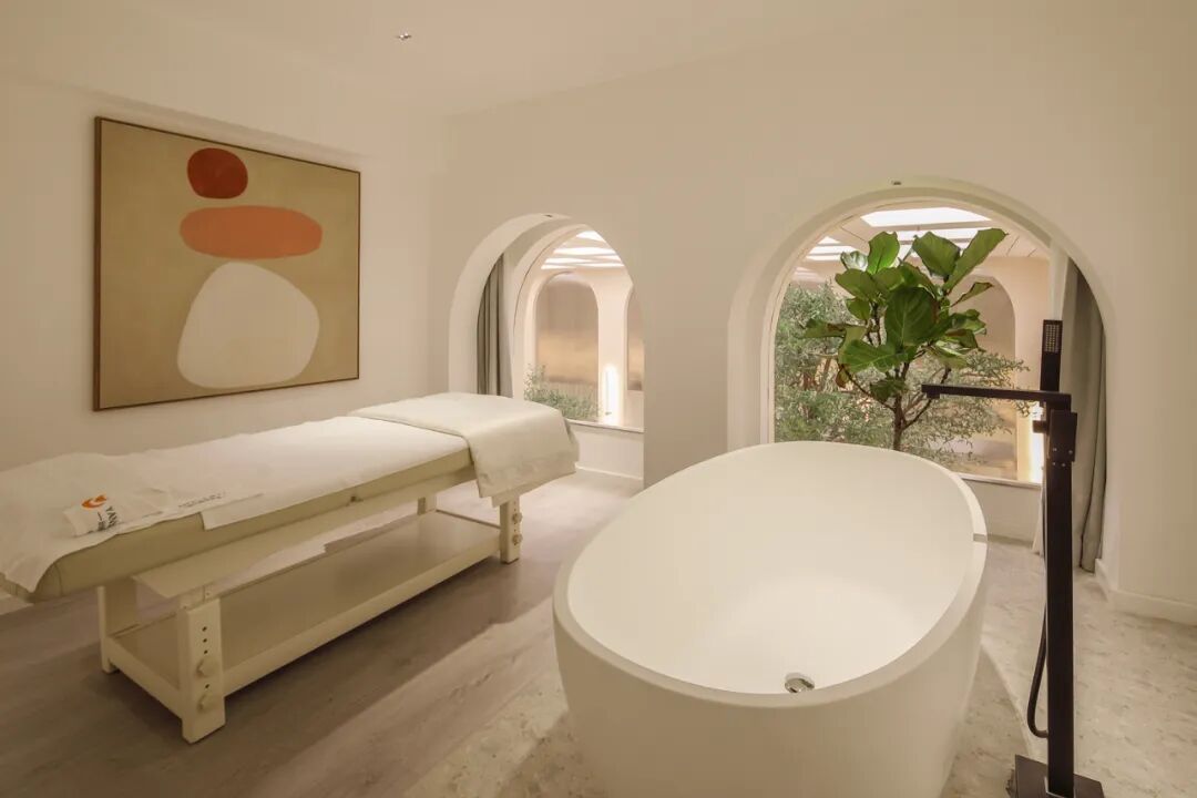 ▷ VIP操作区域配置美容床、收纳柜、流水水槽、拱形休息塌、独立淋浴间+景观浴缸。