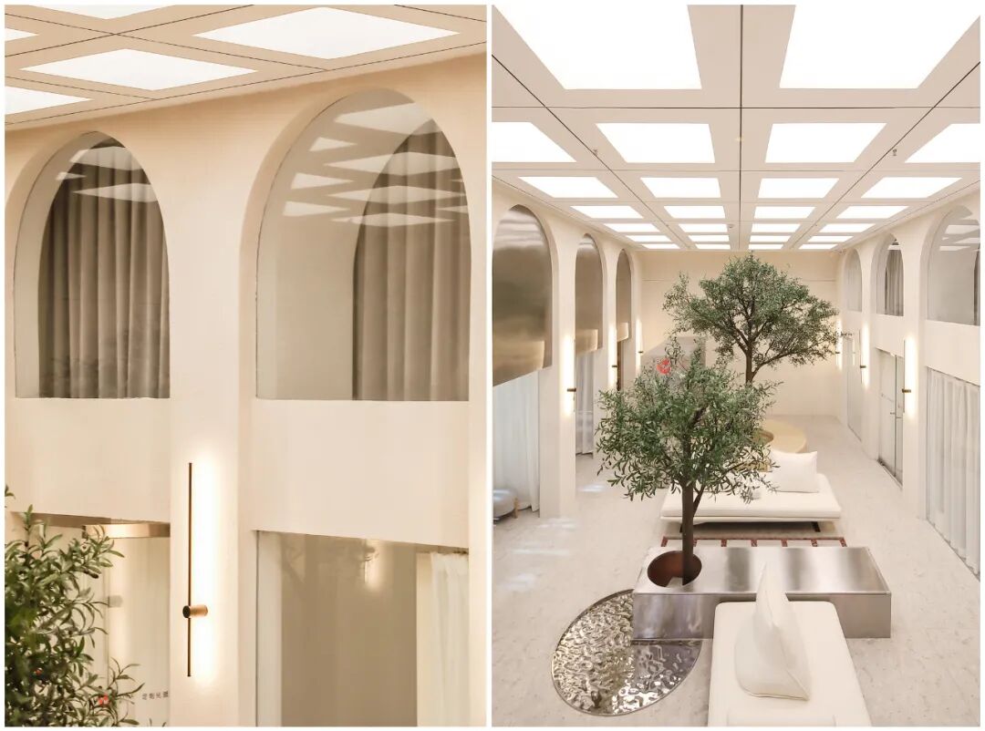 ▷ 中心庭院:后场的美容服务区围绕中心庭院2侧设置。平时2侧双层服务间可共享中心广场的景观,同时中心庭院也可作为课程分享,沙龙集会的休息区。庭院用现代的极简的手法表现古典的形制,通过对称的拱圈窗户,仿天光的天花设计,穿插其中立体构成的绿植、步道、水面设置,让整个庭院丰富充满趣味性。
