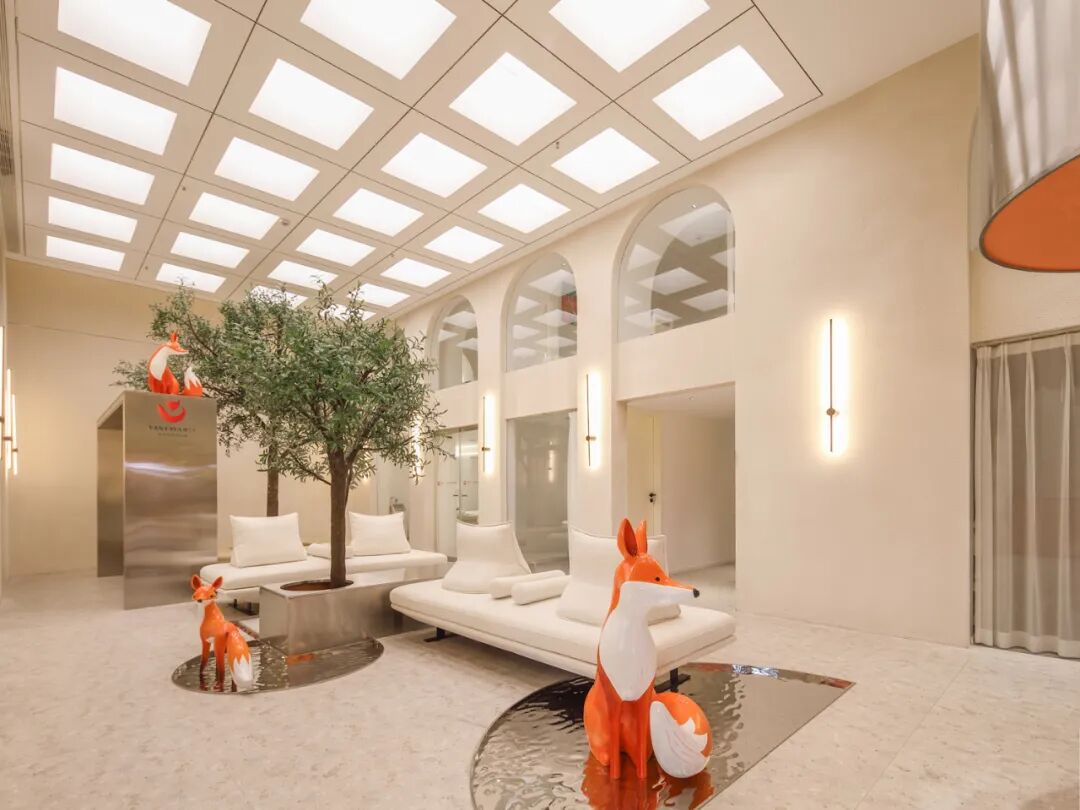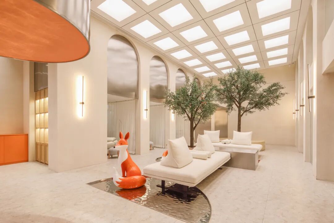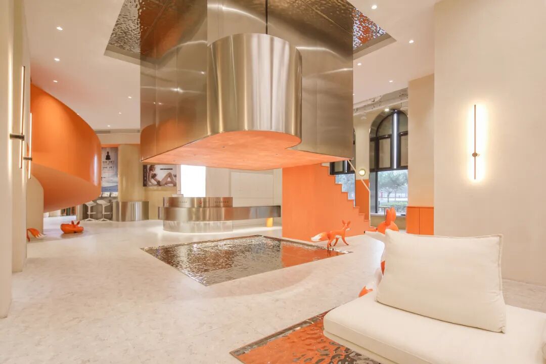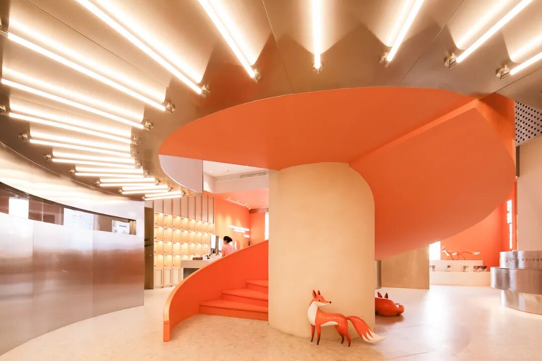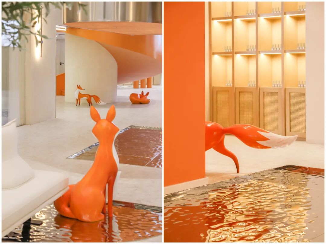 ▷ 具象的表达方式:橙色的狐狸造型雕塑在空间的各处出现,和景观、楼梯、货架结合,或休息、或跳跃,或盘坐、或露出一根尾巴。橙色的身形出现在空间各处,不断提醒大家它无处不在。