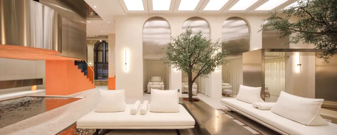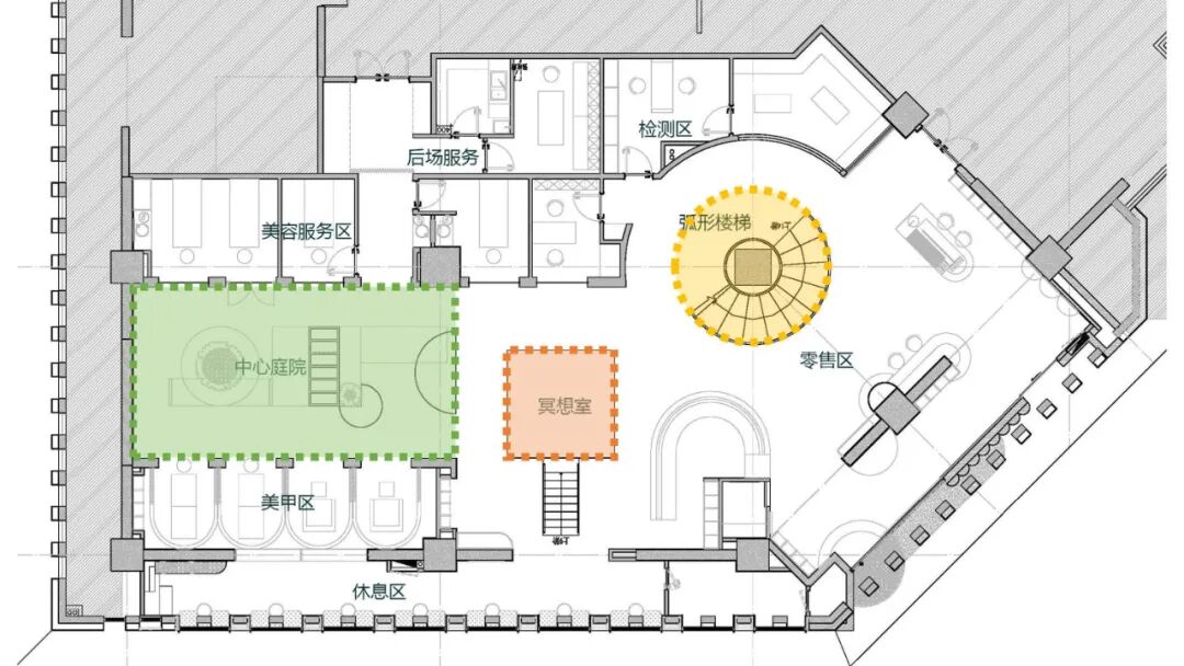 ▷ 零售区与美容服务区之间用橙色弧形楼梯+悬空冥想室做前后划分,2个相对开阔的大空间,通过2个景观节点互相之间卡位,自然形成了一个缩放变化的关系,这种缩放关系的变化,自然形成了空间的变化和层次。景观节点的设立同时也对美容服务区的私密性进行了遮挡。