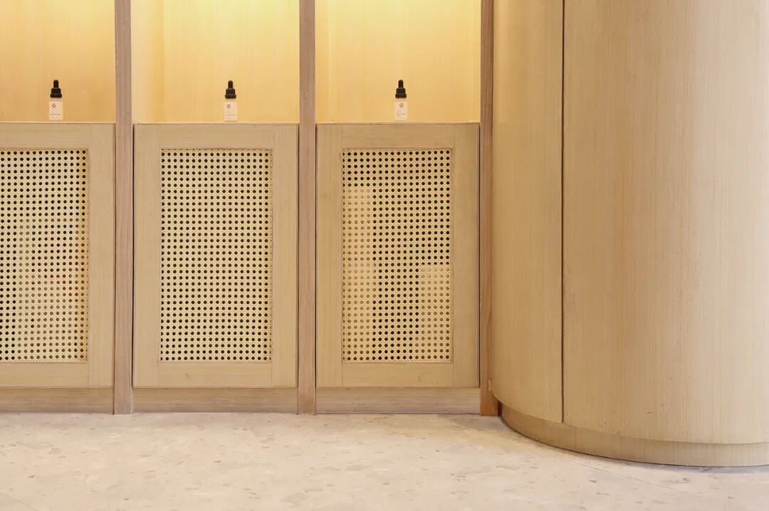 ▷ 美容区利用玻璃+实墙围合出一个房间。1楼的脸部和2楼的身体区域因为不同私密程度的需要做了不同程度的物理分隔。房间内部根据不同的消费层级设置不同的配置。