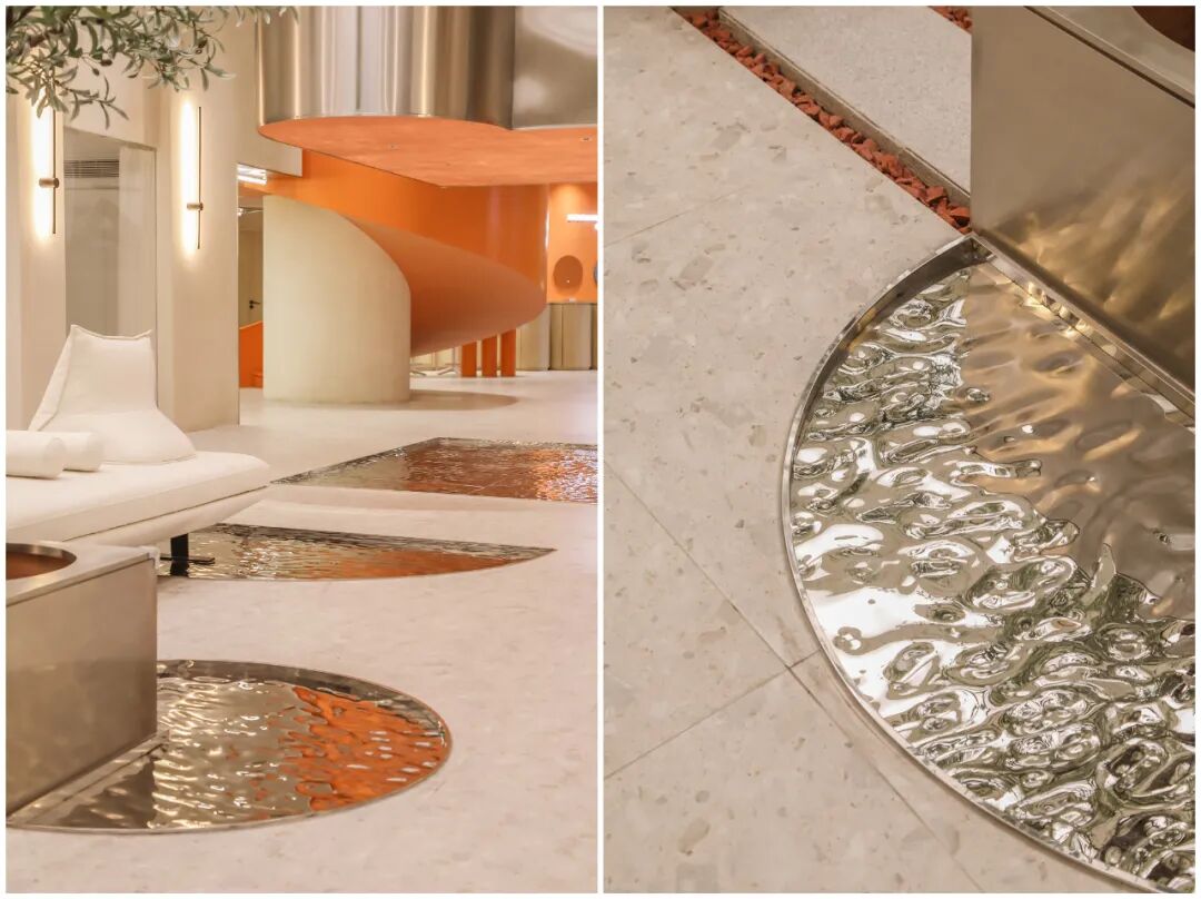 ▷ 美容服务休息区:需要给客户更多稳定、舒适、慵懒的感受,所以才材质上会使用偏自然属性的石材+真石漆+水波纹不锈钢为主。