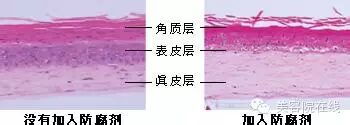 首先,给大家看一下加入防腐剂和没有加入防腐剂的肌肤状态。明显感到加入防腐剂的肌肤的角质层很薄,这样的肌肤就很容易敏感。因此在选择护肤品的时候需要大家留点心,看一看护肤品的成分。