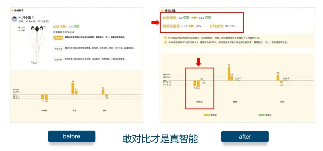 ▷ 当代AI的出现,让普通人也能达到中医从业人员的水准。奈瑞儿集检测、调理、再检测为一体,结合云计算、千万级中医数据库、自有知识产权中医智能算法,更加懂得顾客的身体状况,摒弃传统经验主义,明明白白做调理。▷ AI也让智能检测的操作极其简单,小白员工也能在一小时内熟练掌握并解读,调理后可对比前后数据,有效率高达94.4%,让每一位顾客都能清楚了解自己的身体状况,也轻松赢得顾客的信任。▷ 同时,奈瑞儿智能美养系统还拥有强大的进化潜能,可以记录顾客身体在每次调理中的数据波动,通过对健康数据的不断积累与数据波动的精准识别,真正实现越用越懂你、越用越贴心,最终成长为贴合顾客习惯的专属“名医”。▷ 一个真实案例,体现智能美养的强大之处。顾客肖小姐出现感冒症状,经过奈瑞儿的三维AI检测后,根据检测结果选择对症调理方案,并使用温养仪针对昆仑穴与神阙穴进行温灸20分钟,调理后体能指数从5.9上升至13.3,膀胱经虚弱程度从-15.4上升至-0.5,好转度为96.75%。
