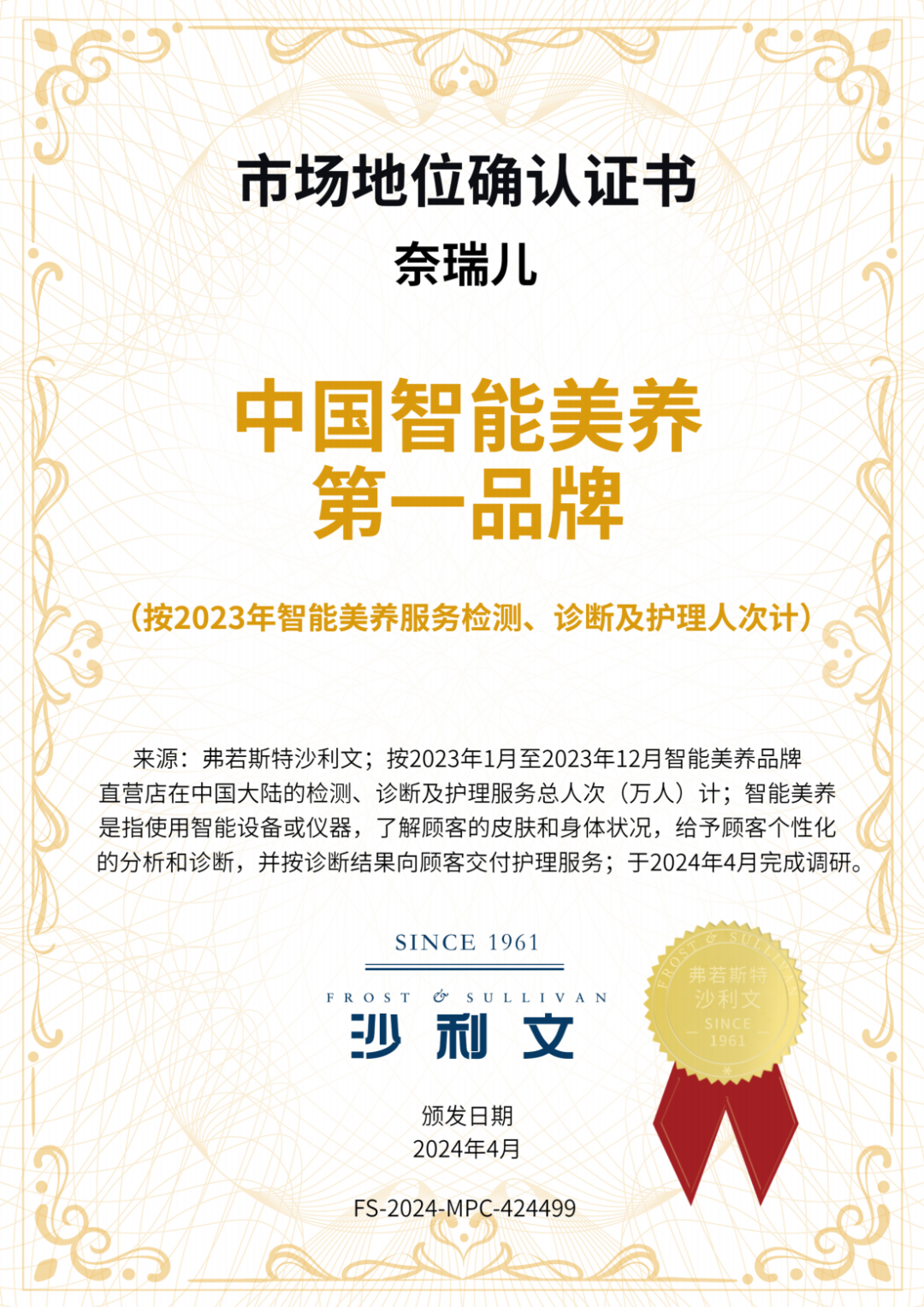 ▷ 奈瑞儿依托丰富的研发经验和个性化的分析诊断,为现代人身体与肌肤亚健康问题提供了有效解决方案。经过沙利文的严格评估,最终以智能美养的服务人次为标准,将“中国智能美养第一品牌”的荣誉授予奈瑞儿。
