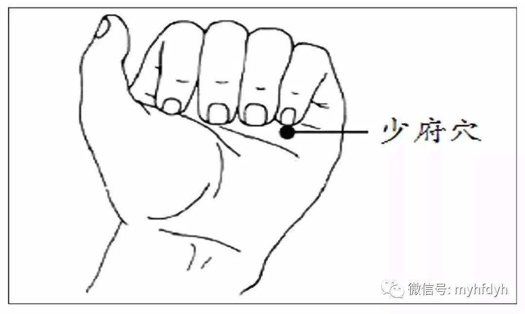 方法:少府穴,握拳时小指与无名指指端之间。按压这个穴位不妨用些力,左右手交替。