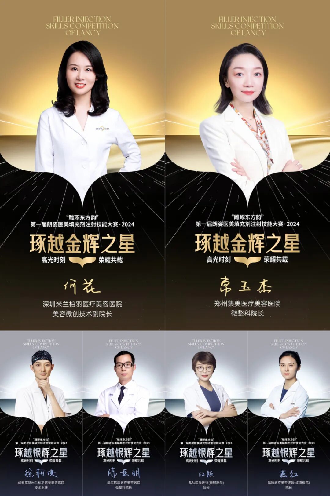 ▷ 决赛选手名单于5月21日总决赛前夜公布,翌日,12位医生直接上场,经现场注射技巧展示、案例答辩的比拼后,专家评审团评选出6位“琢越菁英医生”、4位“琢越银辉之星”。最高大奖“琢越金辉之星”由深圳米兰柏羽医疗美容医院美容微创技术副院长何花、郑州集美医疗美容医院微整科院长常玉杰摘取。