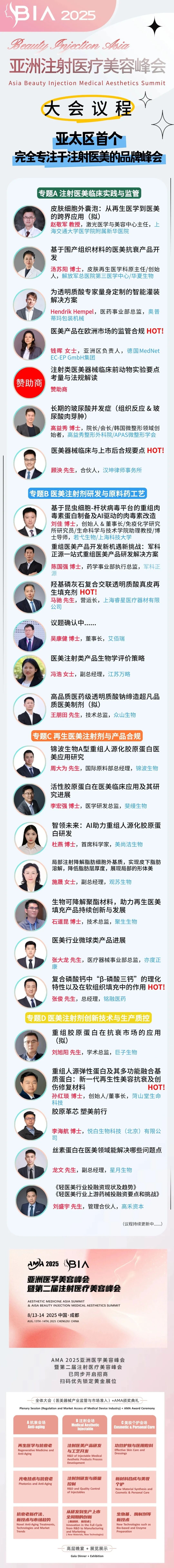 ▷ BIA 2025 亚洲注射医疗美容峰会(Beauty Injection Asia)将于2025年4月2-3日在上海举行,届时将深入探讨注射医美与产品合规监管、医美注射剂研发与原料药工艺、再生医美注射剂与创新工艺技术、医美注射剂生产与质控等关键议题。