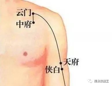 位置:立正、叉腰站直,用手可以摸到在锁骨外侧下端的三角窝,那里的中心就是云门穴,在这个窝的正中垂直往下推一条肋骨的地方就是中府穴。