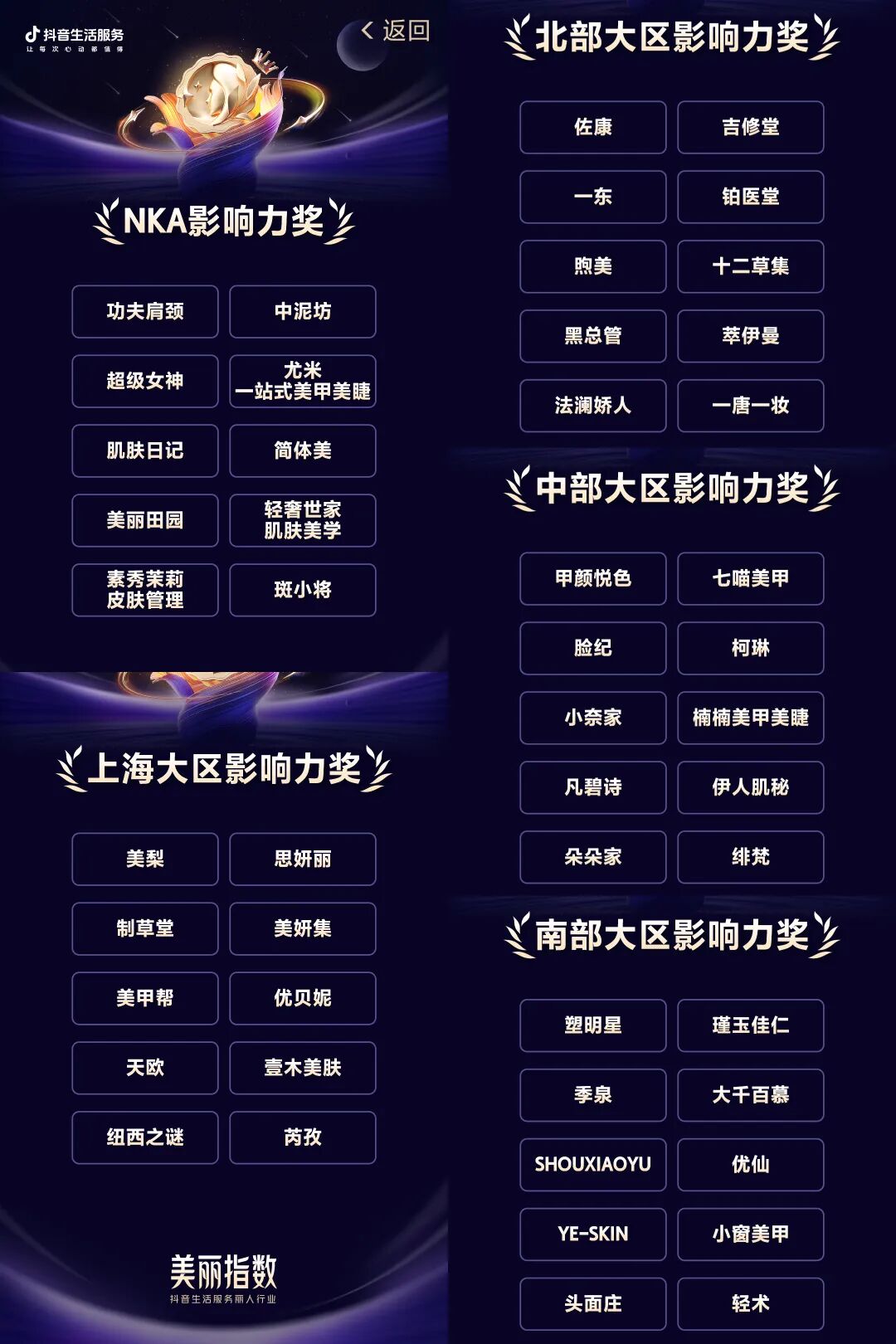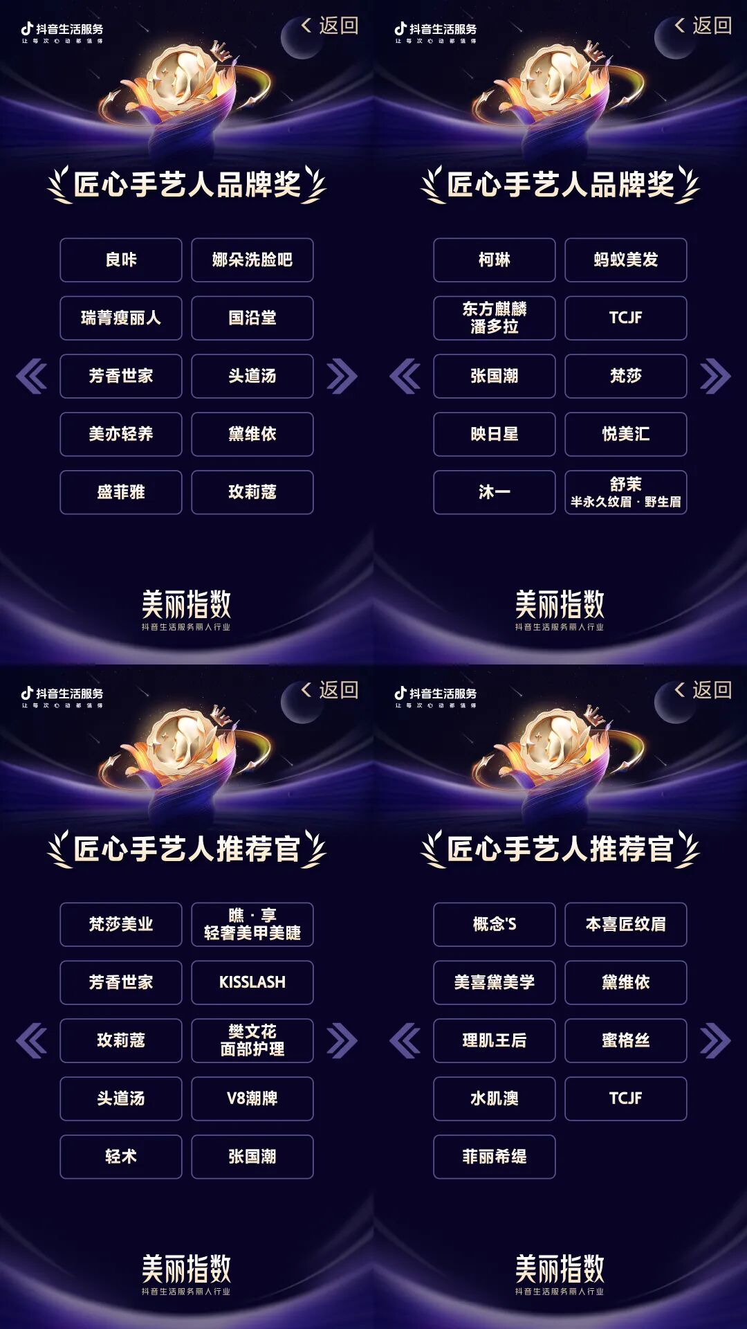 大会共颁发了“行业规模影响力奖”“丽人影响力人物奖”“行业经营突破奖”“匠心手艺人品牌奖”“匠心手艺人推荐官”“分赛道卓越奖”及”大区影响力奖”等7大奖项。获奖品牌不仅展现了经营实力,更是与“真实数据+专业标准”核心体系深度契合的生动体现。