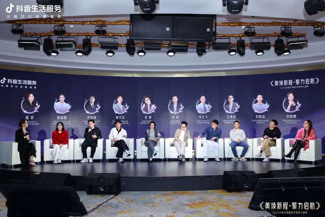 盛典现场,抖音生活服务线索行业负责人李泉发表致辞,回顾了抖音生活服务对丽人行业的赋能,并与抖音生活服务NKA到店服务行业高级经理贺曼、抖音生活服务NKA到店服务行业高级经理李云飞、抖音生活服务NKA到店服务行业高级经理潘妍,以及南部大区广州二区及佛山业务负责人黄文杰、中部大区鄂湘赣区域负责人尹亚洲、北部大区江苏区域负责人刘晓峰、南部大区深莞惠珠区域负责人王清龙、中部大区运营负责人刘颜溪、北部大区山东区域济南二区负责人杨晶晶等各市场区域负责人展开圆桌讨论,围绕4个关键议题,分享了2025年抖音生活服务丽人行业的突破。