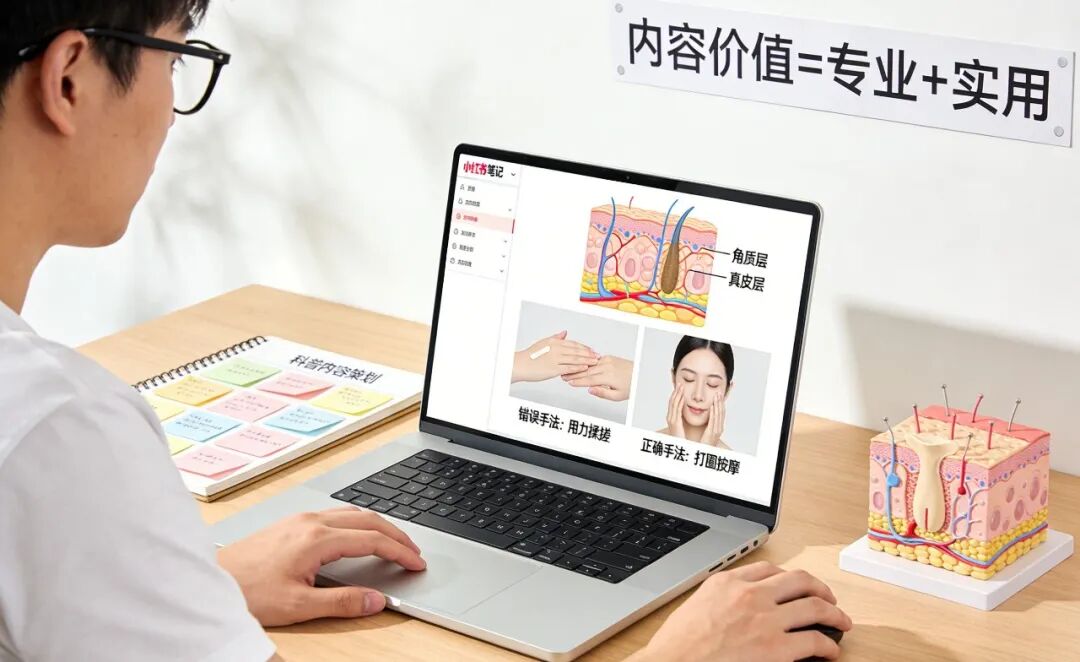 小红书笔记后台编辑界面,运营者正上传 “敏感肌护理误区” 科普图:首图是显微镜下的皮肤结构图,内页对比 “正确 vs 错误洁面手法”,结尾引导 “点击预约免费皮肤检测”,数据面板显示该类笔记转化率达 18%。