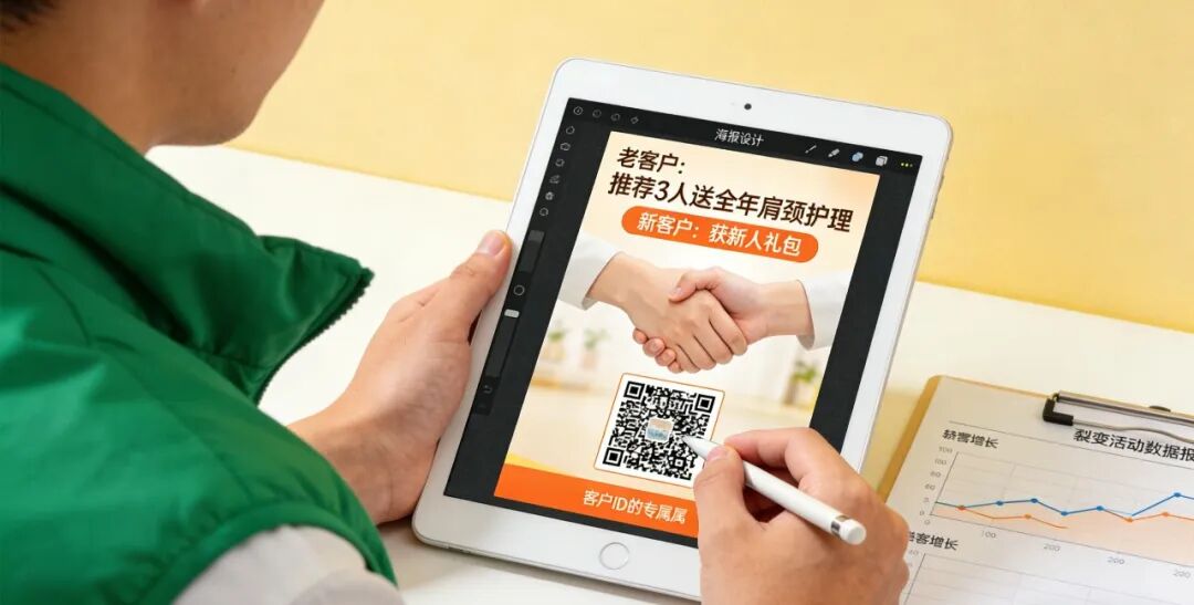 海报设计软件界面,运营者正修改 “老带新活动” 海报:老客户推荐 3 人到店送 “全年肩颈护理”,新客户获 “新人礼包”,海报底部二维码关联客户专属邀请链接,后台数据显示该活动平均每位老客户带来 2.3 个新客。