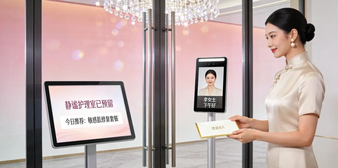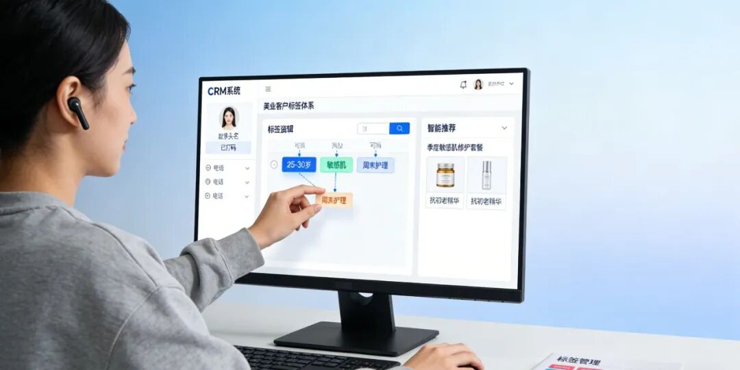 CRM 系统后台界面,运营专员正用拖拽方式为客户添加标签:“25-30 岁 / 敏感肌 / 每月消费 2 次 / 偏好周末护理”,右侧自动生成 “该客户适合的季度护理套餐” 推荐列表,标签云图中 “抗初老”“无推销” 高频出现。