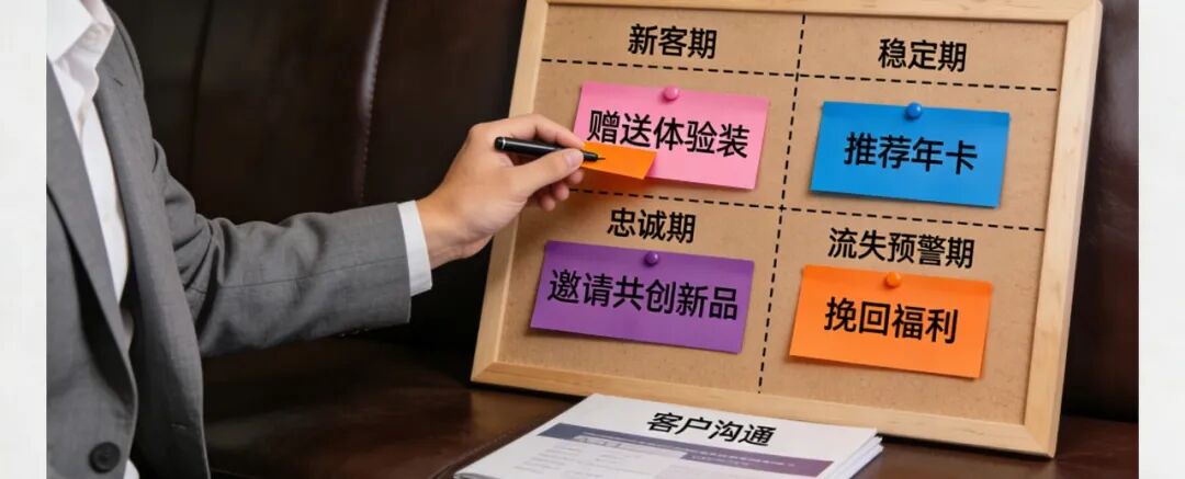 生命周期管理看板上,不同颜色磁贴标注客户阶段:粉色 “新客期”(赠送体验装)、蓝色 “稳定期”(推荐年卡)、紫色 “忠诚期”(邀请共创新品)、橙色 “流失预警期”(专属挽回福利),运营者根据磁贴位置调整沟通策略。