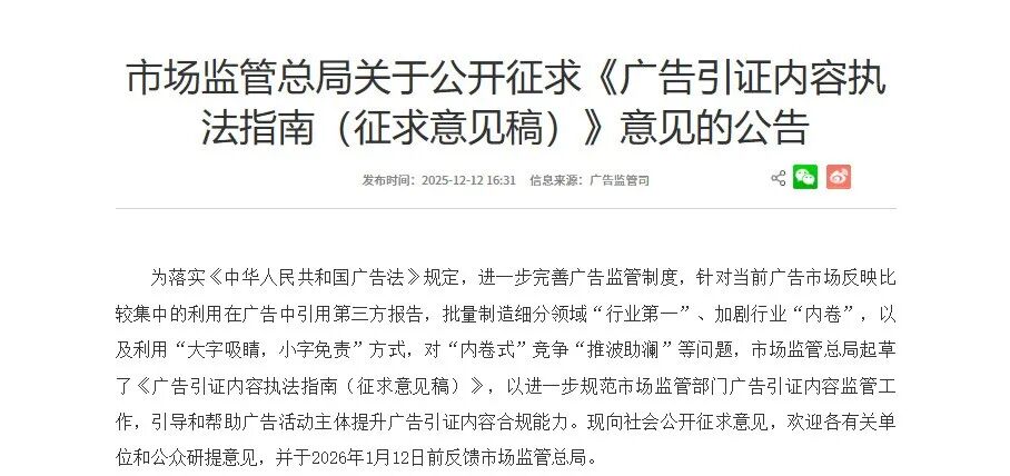 《广告引证内容执法指南(征求意见稿)》发布