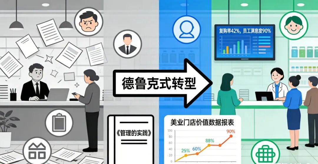 上海某高端皮肤管理连锁的转型案例很有代表性:2025年前,门店实行“底薪+手工费+个人提成”,核心是“管业绩”,技师抢客、客户投诉多,离职率高达35%;2025年下半年引入德鲁克“目标管理+顾客价值”体系,核心转向“管成果、管价值、管成长”,仅6个月,离职率降到10%,复购率提升40%,业绩增长28%。