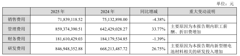 此外,天赐材料2025年销售费用同比下滑4.38%,而管理费用、研发费用则分别大涨33.77%、26.75%。