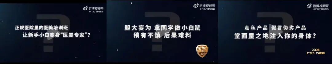 此外,3月14日晚,广东广播电视台播出的2026《广东3·15晚会》中,有关医美速成班、无证医美、使用走私、假冒伪劣产品等现象再次进入公众视野。