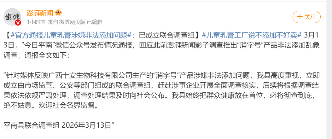 事情曝光后,官方通报了儿童乳膏涉嫌非法添加问题:已成立联合调查组。