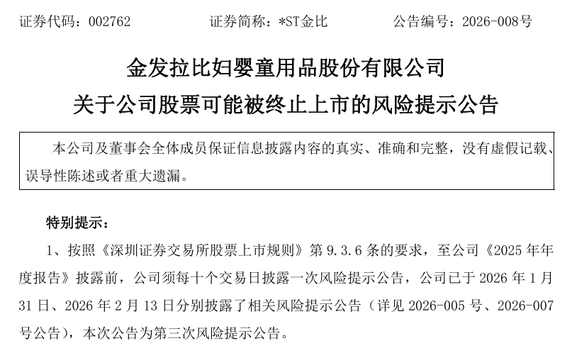 本周,曾被称为“母婴第一股”的金发拉比妇婴童用品股份有限公司(证券简称:*ST金比)发布了关于公司股票可能被终止上市的风险提示公告。值得一提的是,这已经是其第三次风险提示公告。