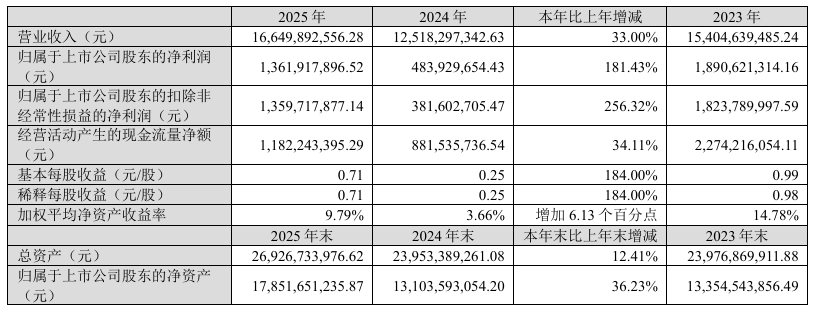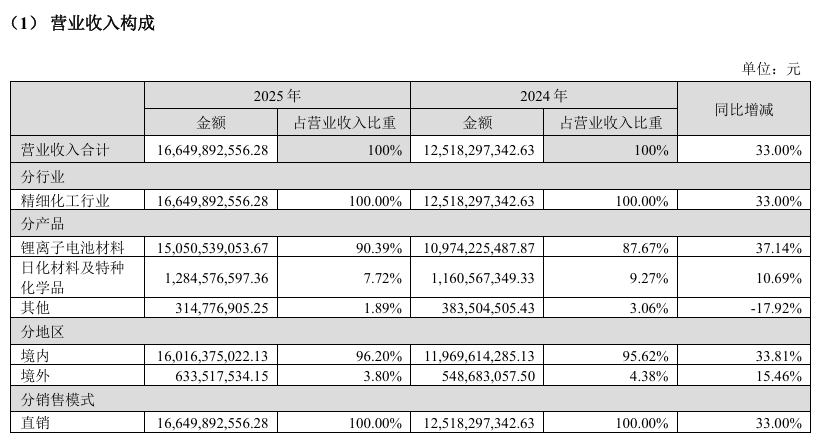 本周,广州天赐高新材料股份有限公司(下称:天赐材料)发布了2025年年度报告,据披露的财报显示,其2025年营收为166.50亿元,同比增长33%,归母净利润暴涨181.43%至13.62亿元,归母扣非净利润暴涨256.32%。