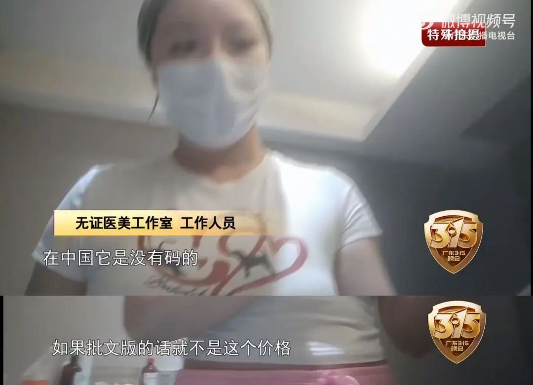 据其暗访的某无证医美工作室工作人员表示:“我这个药是韩版的……在中国它是没有码的……如果批文版的话就不是这个价格。”