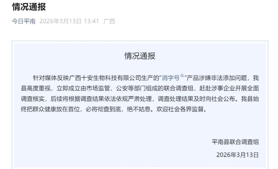 据今日平南公众号情况通报显示:“已成立由市场监管、公安等部门组成的联合调查组,赶赴涉事企业开展全面调查核实,后续将根据调查结果依法依规严肃处理,调查处理结果及时向社会公布。”