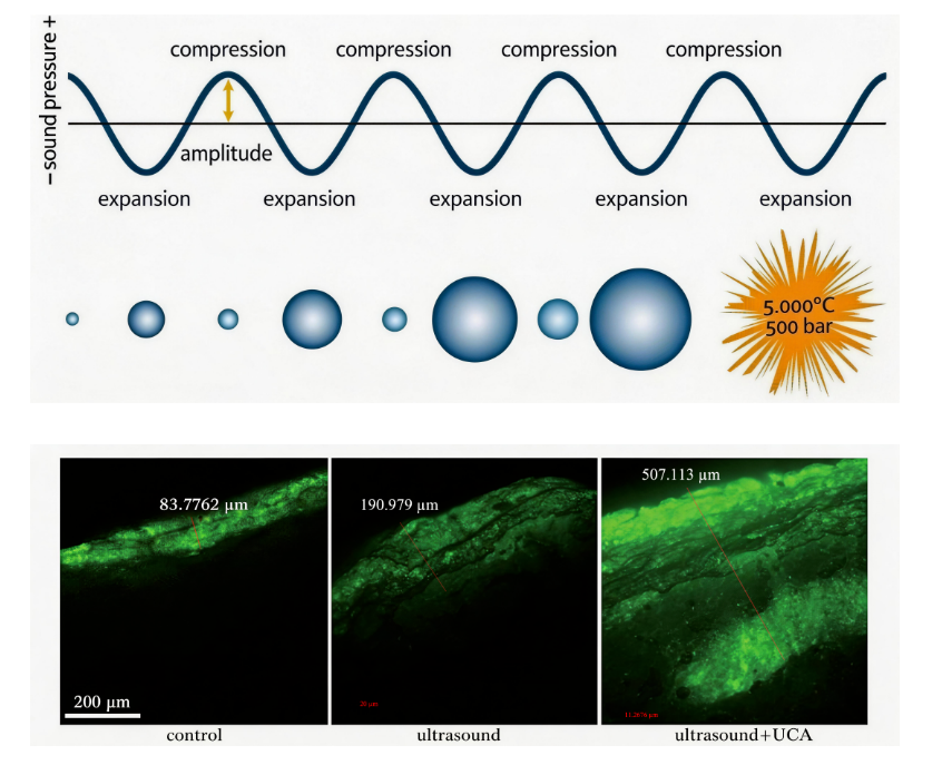 ▷ 低频超声可诱导衰老细胞再生,其空化效应产生的冲击速度约为100 m/s(接近1/3音速),如同超细微针(Popinet S, Zaleski S. Bubble collapse near a solid boundary: a numerical study. Journal of Fluid Mechanics, 2002)。结合低温预处理,无创透皮技术可实现特定大分子功效物质10倍的透皮递送浓度和6倍的递送深度(Zhang Y, et al. Enhanced transdermal delivery by low-frequency ultrasound combined with cryotherapy. Chinese Physics B, 2016, 25(12): 124314)。