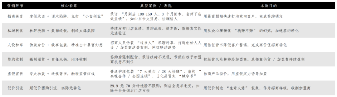 面对高投流与高签约成本,美业加盟的营销套路也在持续迭代升级,形成一套完整的收割闭环。招商端,品牌以高到店、快回本、下店帮扶为诱饵,签约后却强制配货、承诺悬空,收割小白创业者;获客端,招商人员伪装成“过来人”私聊种草,品牌通过人设打造、网红造势强化赚钱幻觉;转化端,私域社群持续发布业绩战报,用虚假数据制造火爆氛围;运营端,超低价团购引来羊毛党,承诺的业绩保底彻底落空,加盟商陷入持续亏损。换句话说,今天的美业招商早已不只是卖产品、卖项目,而是在卖一套由信任感、回本预期、成功幻觉组成的转化机制。