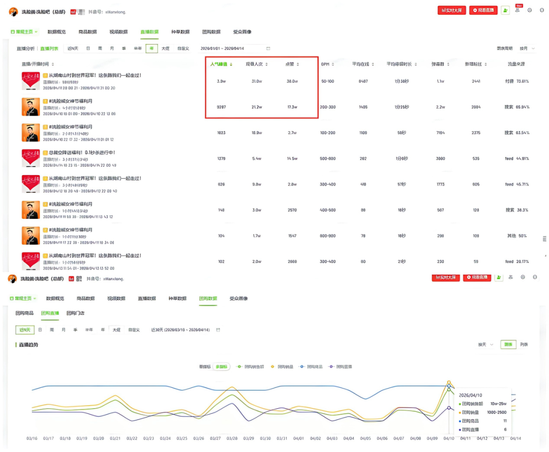 (来源:抖音截图)表面上看,这是一场草根创业者与冠军车手之间的情怀共鸣;更深层看,这是一场教科书级别的事件营销,核心目的只有一个:用流量引爆品牌,为加盟扩张强势造势。飞瓜数据显示,4月10日拍下机车当天,@洗脸熊·洗脸吧(总部)抖音直播间团购销售额达到10万—25万元,创下2026年以来该账号峰值;4月11日,直播间人气峰值3.9万,观看人次31万、点赞38万,同样刷新年内纪录。