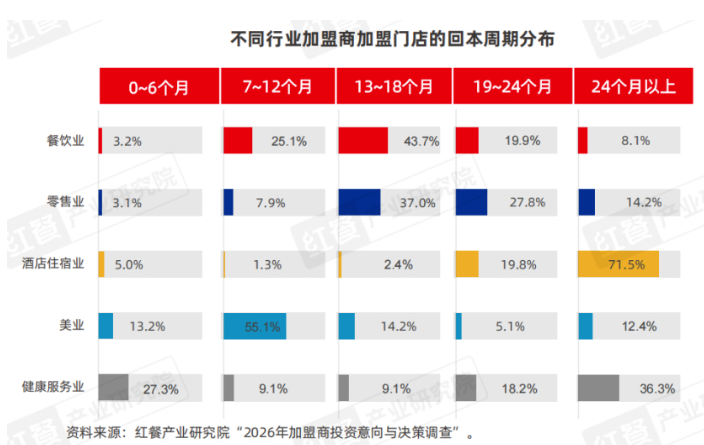 从卖品牌到卖模型,中国美业招商真正没变的,从来不是卖什么,而是始终在卖“普通人可以借此翻身”的想象。《中国连锁加盟商业发展白皮书2026》显示,超过50%的美业加盟商相信门店可在7—12个月内回本。对比来看,酒店行业单店投入高,回本周期普遍在2年以上,美业这种“低投入、快回本”的诱惑,格外刺眼,也成为无数小白创业者踩坑的根源。