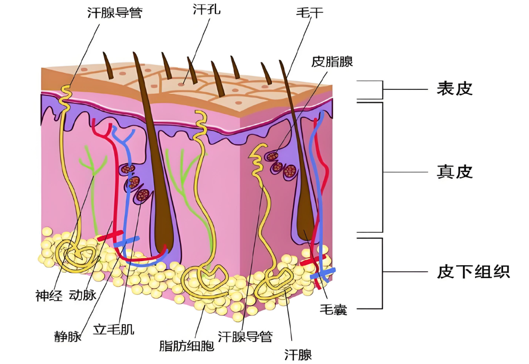 答:与皮肤老化有直接关系的是真皮,真皮是由胶原纤维及弹性纤维所构成。